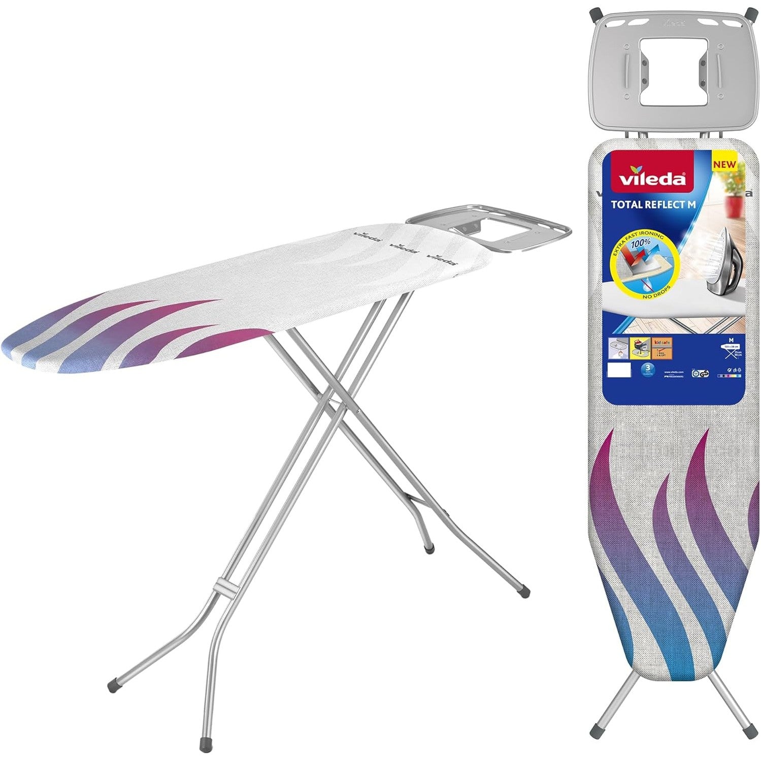 170128 - VILEDA Total Reflect M, Dërrasë Hekurosjeje 120x38 cm me Teknologji Reflektimi të Nxehtësisë dhe Avullit, Lartësi e Rregullueshme 76-96 cm