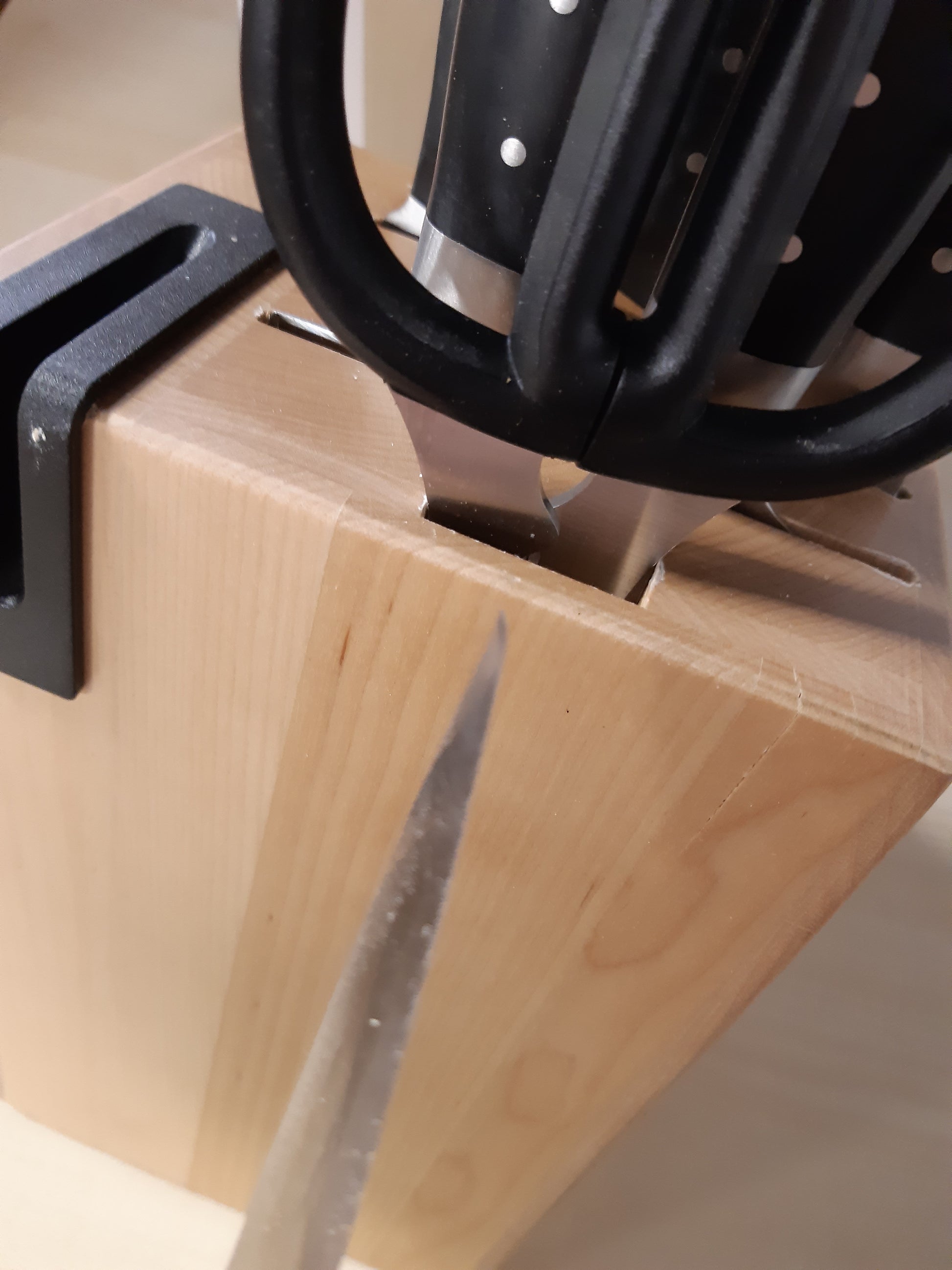- Seti KitchenAid ka një mprehëse praktike për thika të integruar në bllok, e cila mundëson ruajtjen dhe mprehtësimin e lehtë të thikave.
