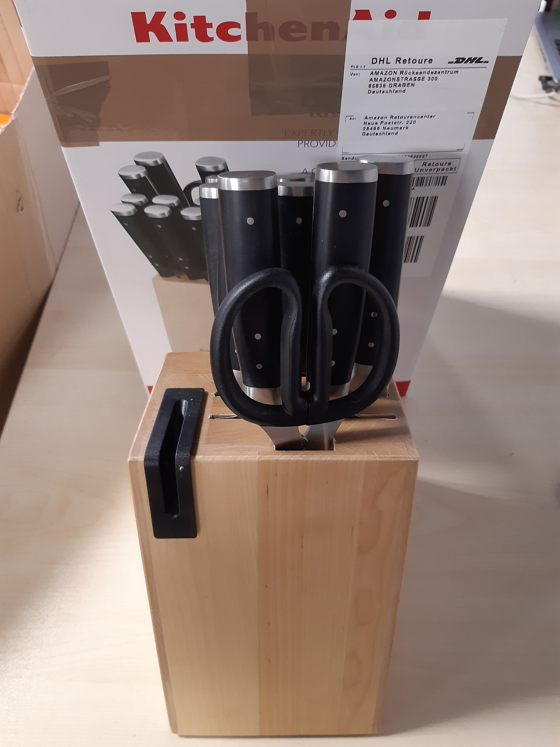 - Pajisjet thekësore KitchenAid përfshijnë një thikë kuzhine 20 cm, thikë buke 20 cm, thikë santoku 13 cm, thikë për prerje 9 cm, 6 thika për biftek dhe gërshërë, të vendosura në një bllok prej druri thupre.